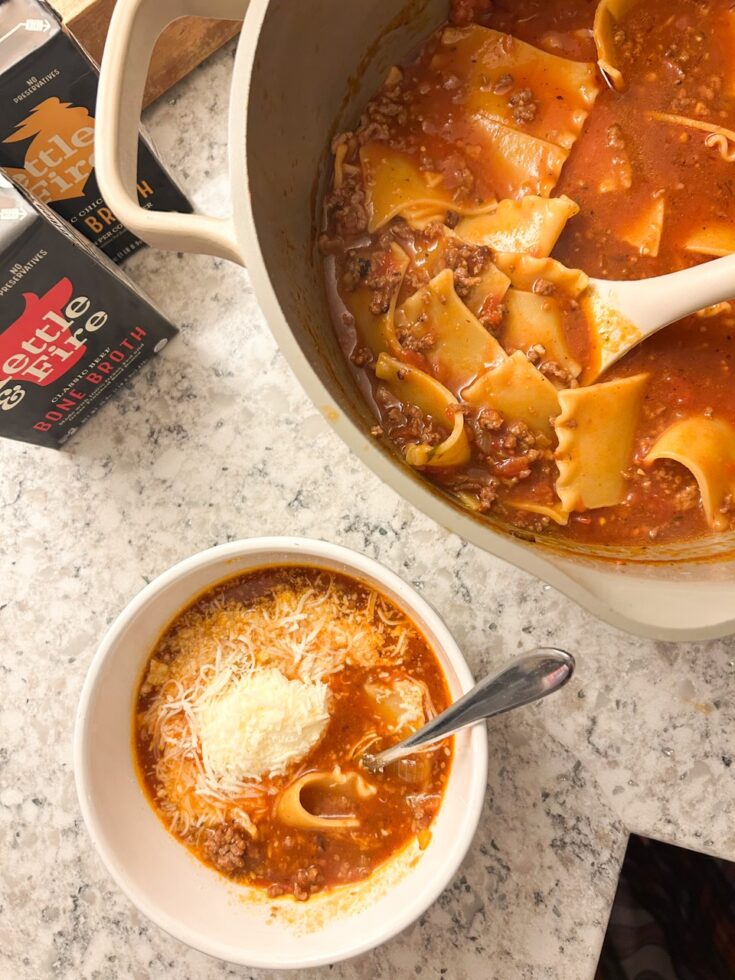This lasagna soup is everything you love in traditional lasagna only in soup form! Made with chicken and beef bone broth, this soup is packed full of protein and flavor. It will become your new favorite comfort meal!