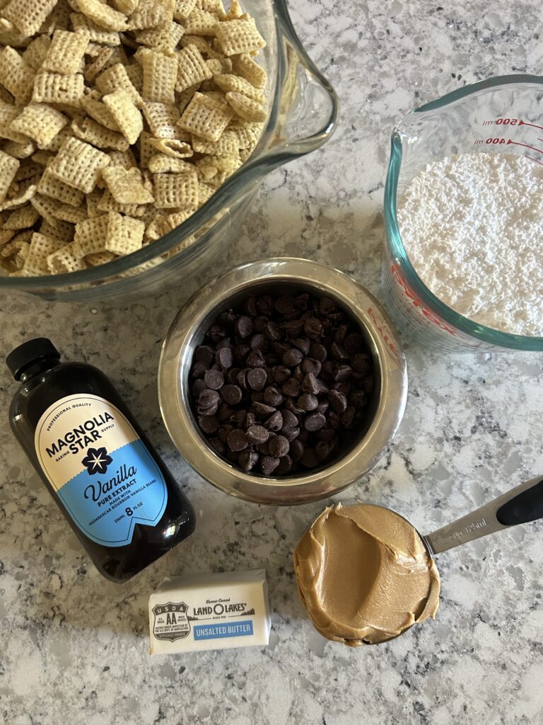 Puppy Chow is made with just a handful of ingredients are are so easy to put together. Below is a list of everything you will need to make these easy holiday treat.