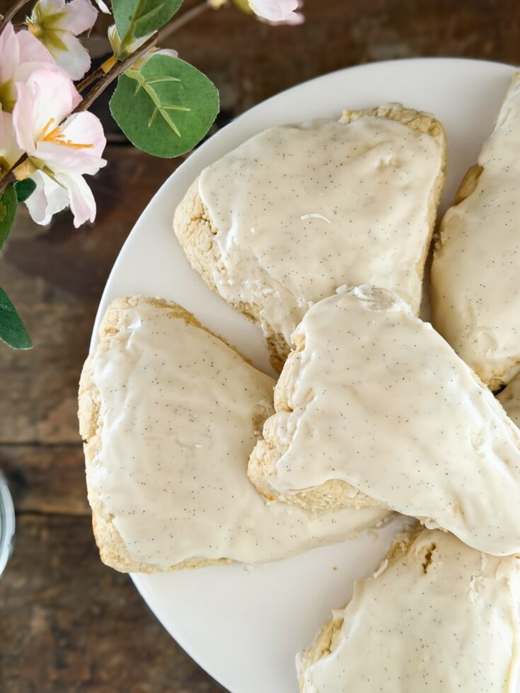 - In a small bowl, stir the powdered sugar, vanilla, vanilla bean paste, and heavy whipping cream together until smooth. Spread a small amount of glaze on top of each scone using a pastry brush.